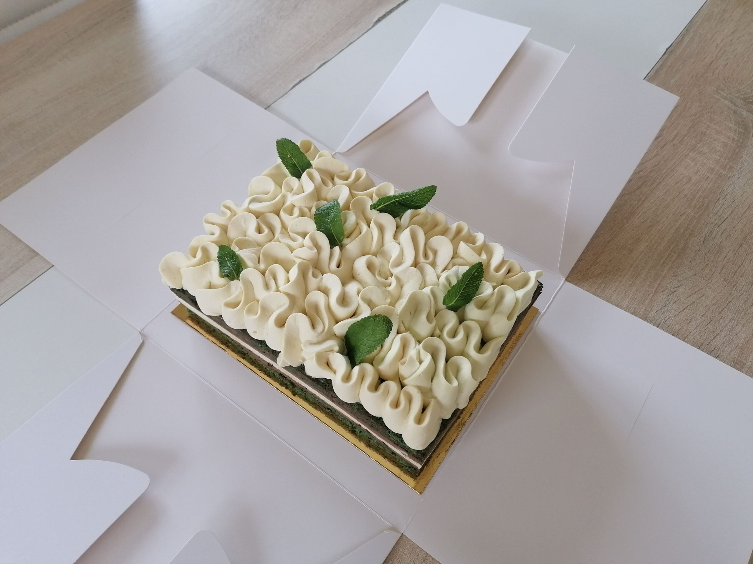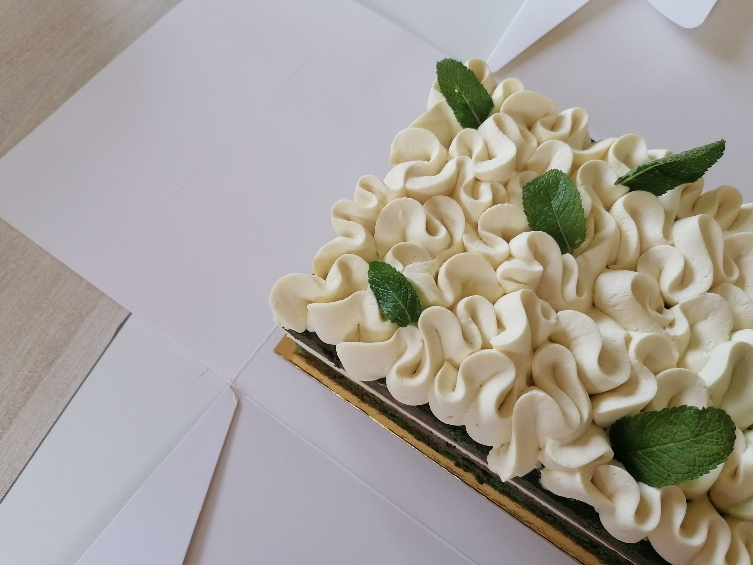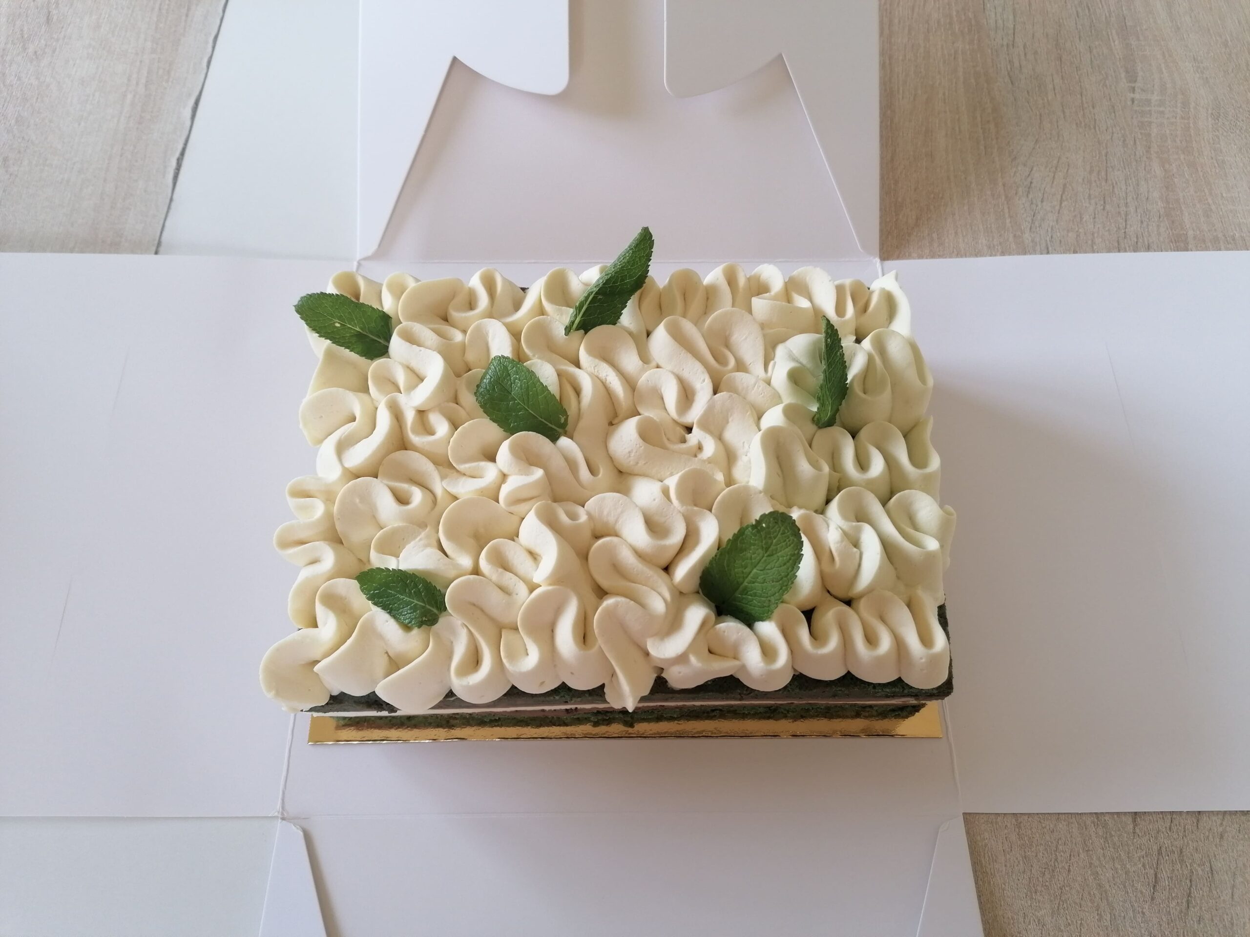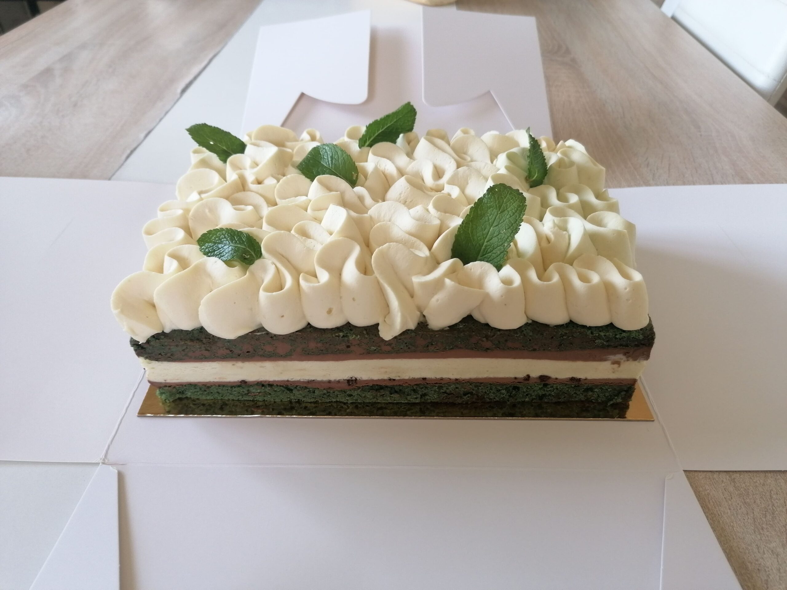 – Son décor : une ganache montée mascarpone menthe fraîche accompagnée de quelques feuilles de menthe