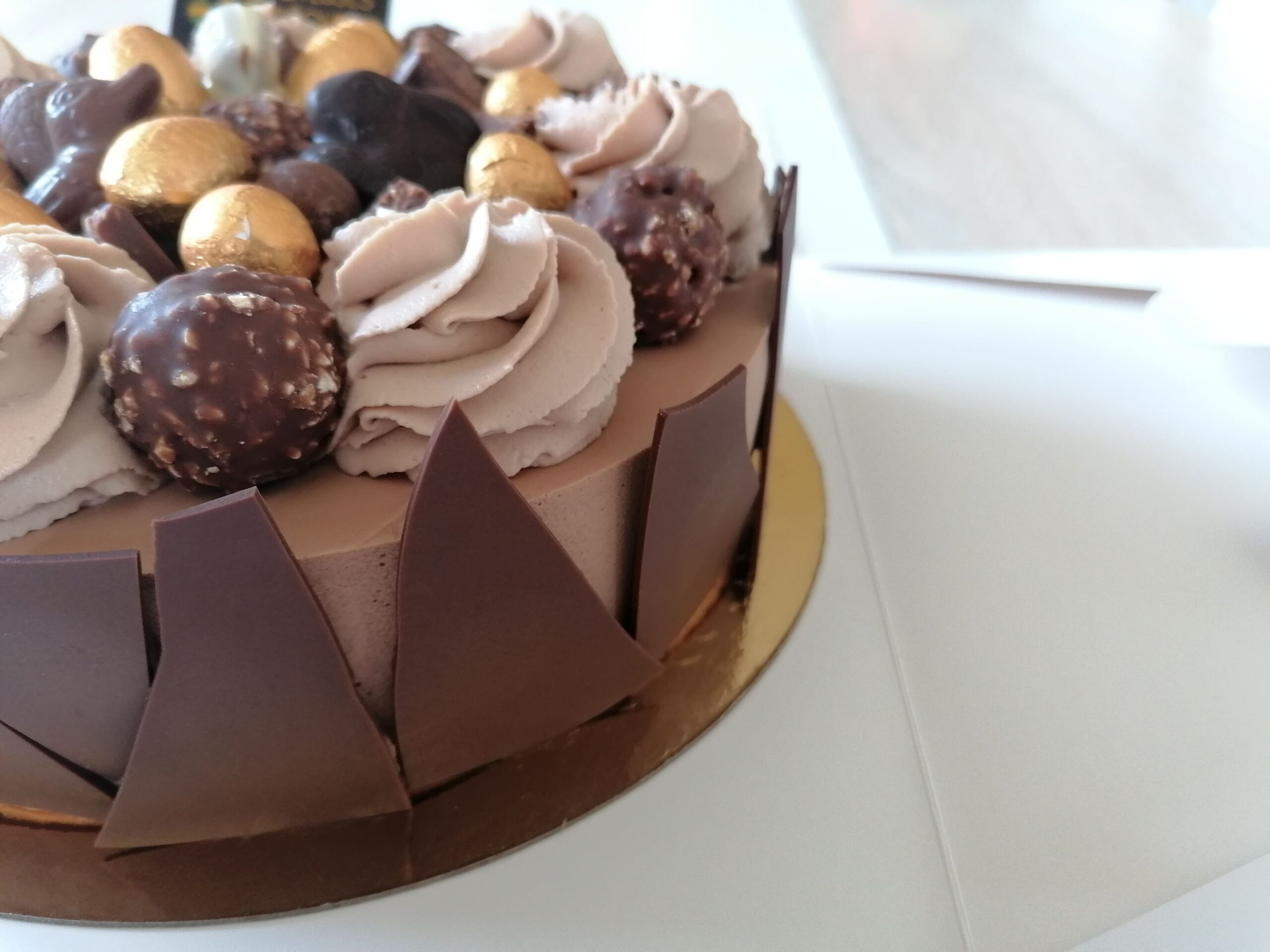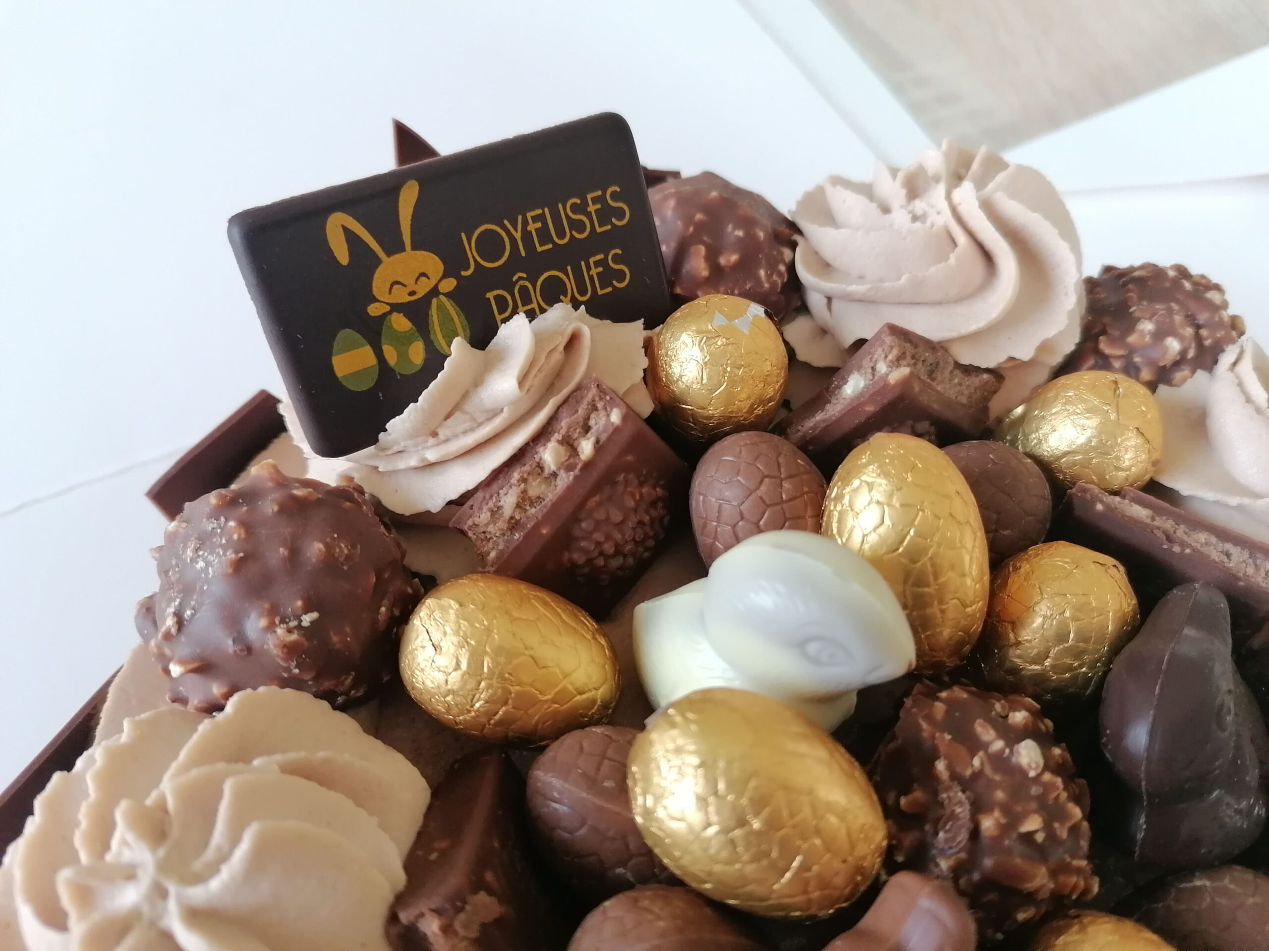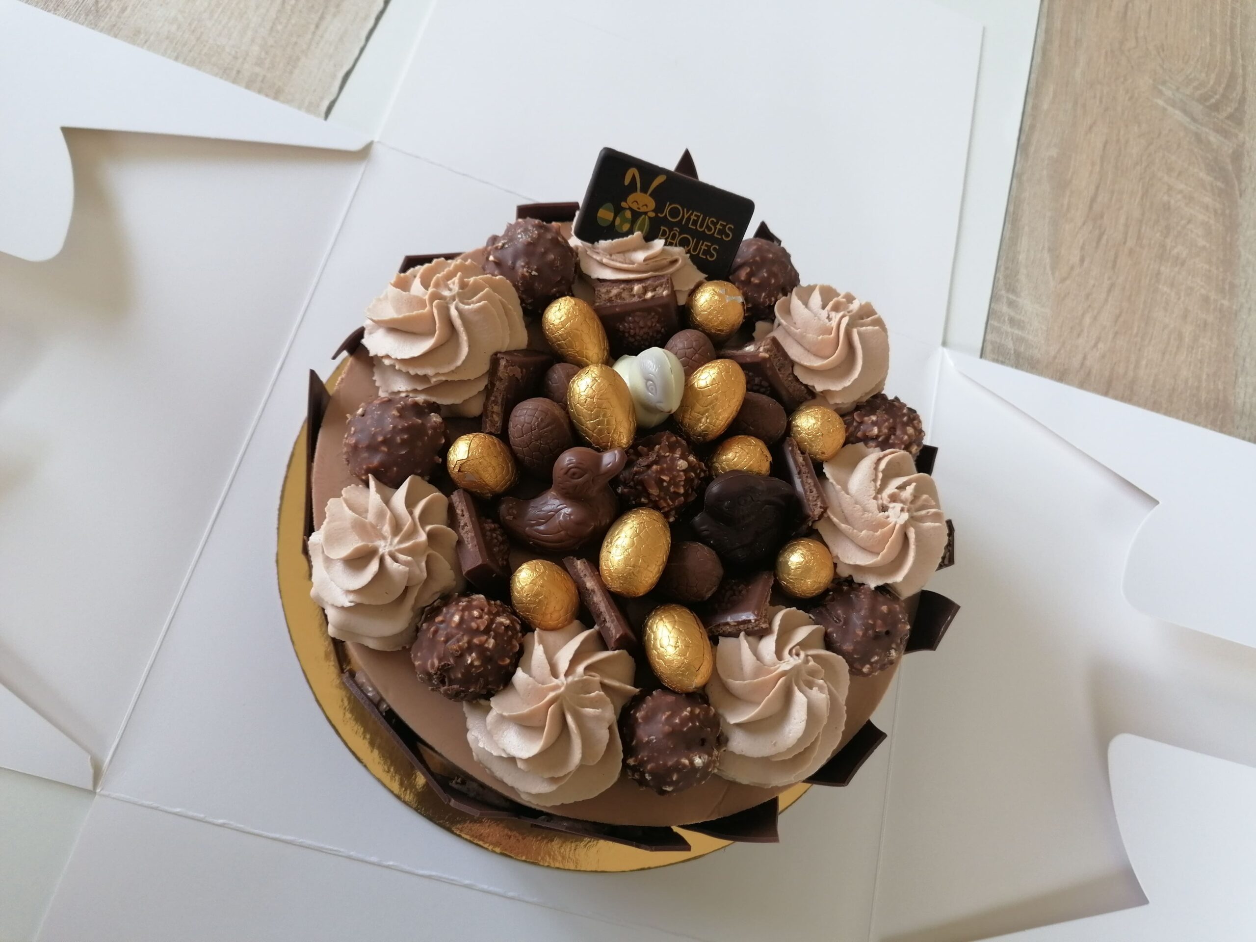 – Son décor : des Ferrero rocher placés, entre autre, entre des rosaces de mousse choco lait montée avec de la mascarpone, des carrés de tablette Ferrero, un décor spécial Pâques avec des sujets et des œufs au chocolat ainsi qu’une plaquette choco « Joyeuses Pâques »