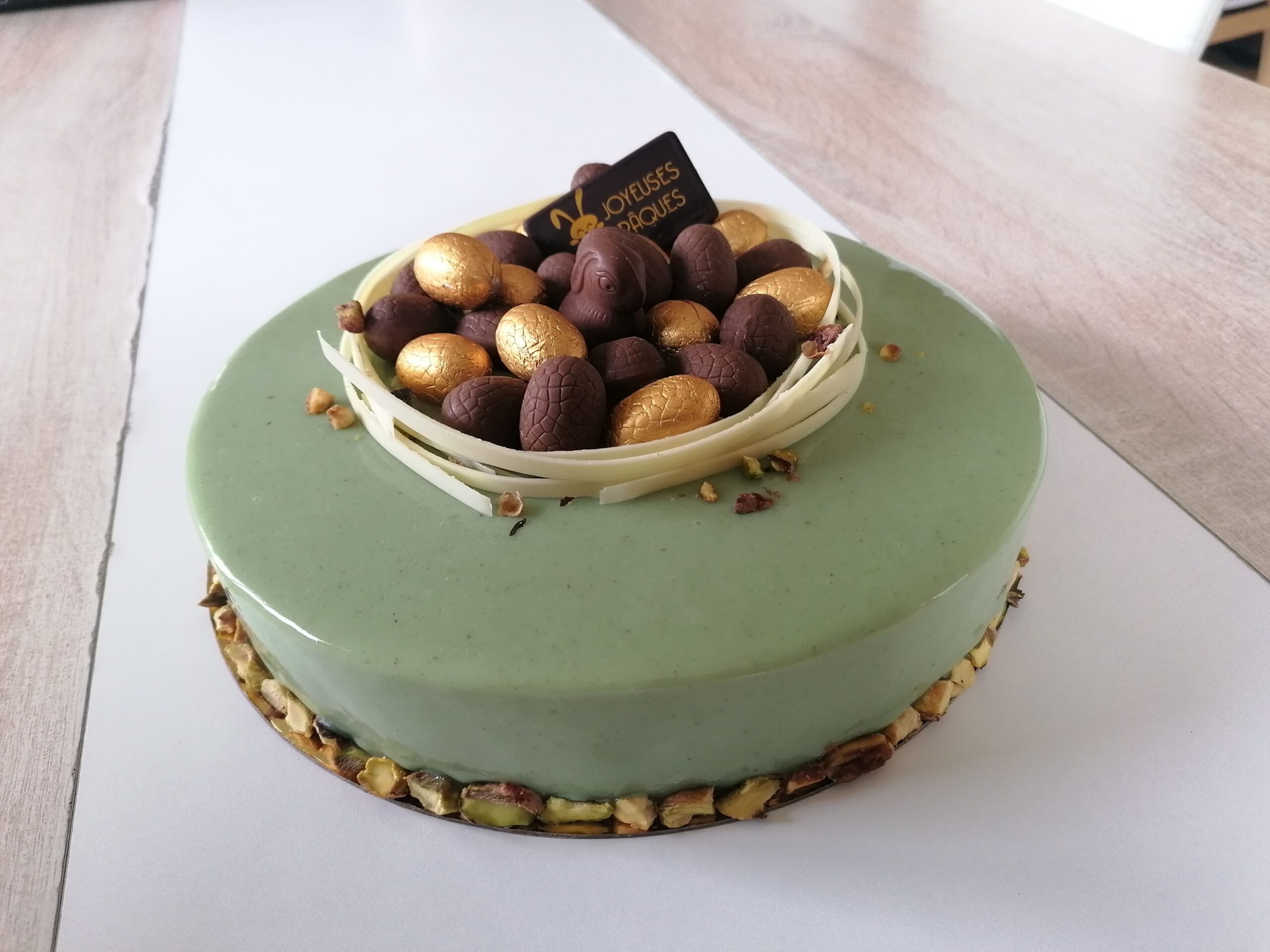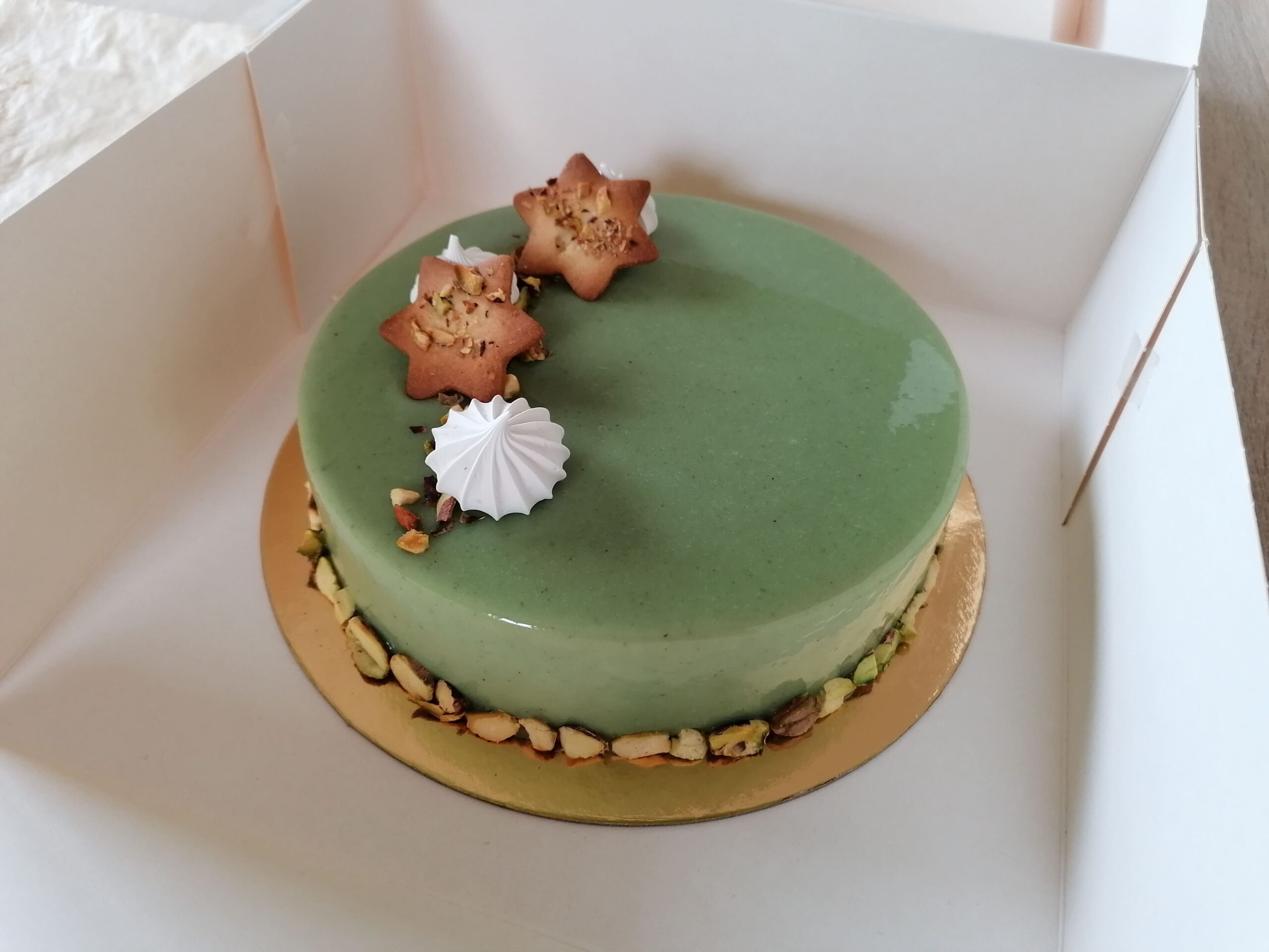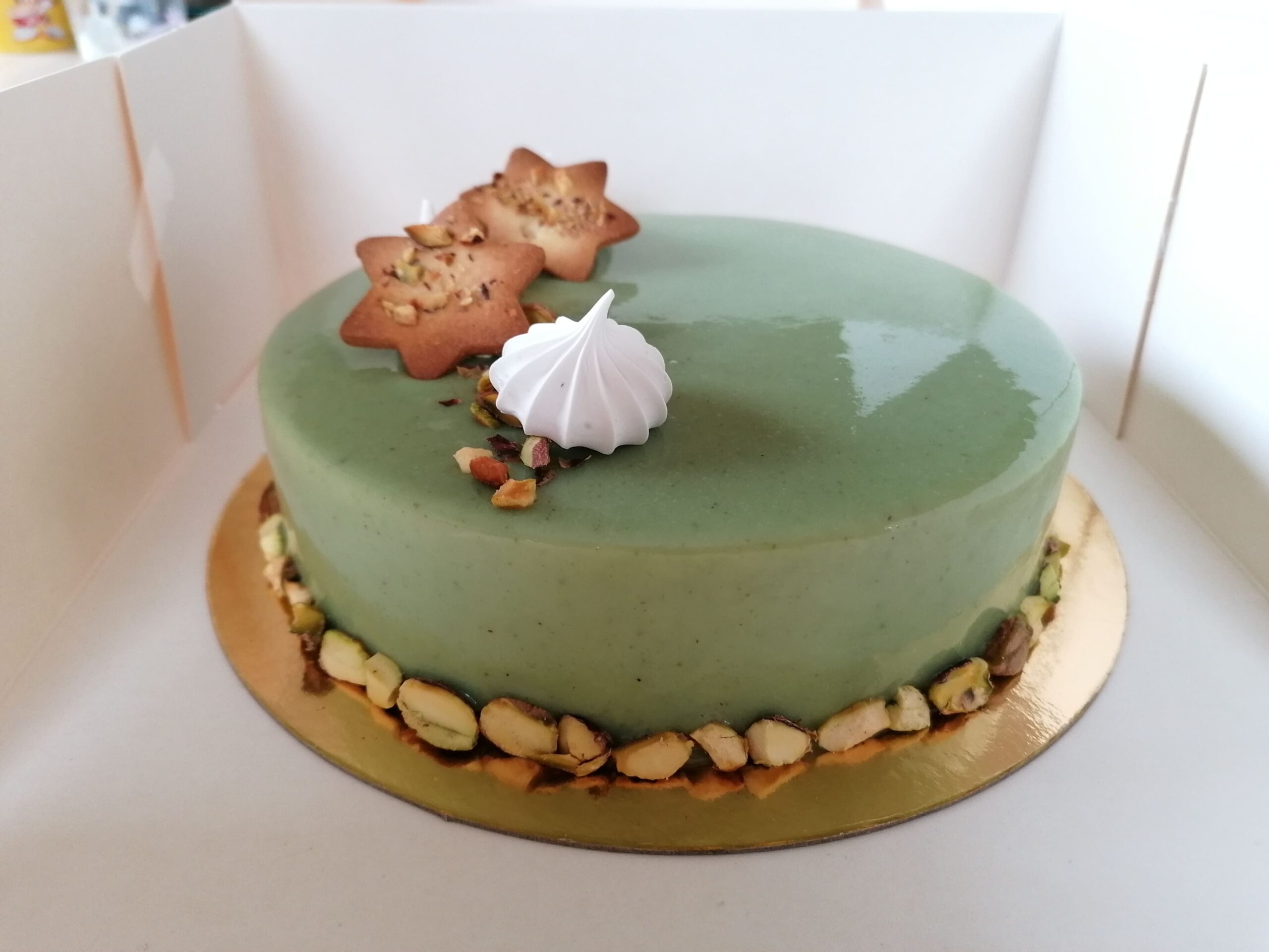 – Sa base : un biscuit financier pistaches recouvert d’un croustillant pistaches– Son insert : un crémeux pistaches– Sa garniture : une mousse bavaroise pistaches– Son glaçage : un glaçage miroir pistaches– Son pourtour : des pistaches torréfiées et concassées– Son décor final : des pièces en pâte sucrée composées de morceaux de pistaches et/ou des meringues aromatisées à la pistache, quelques pistaches torréfiées et concassées