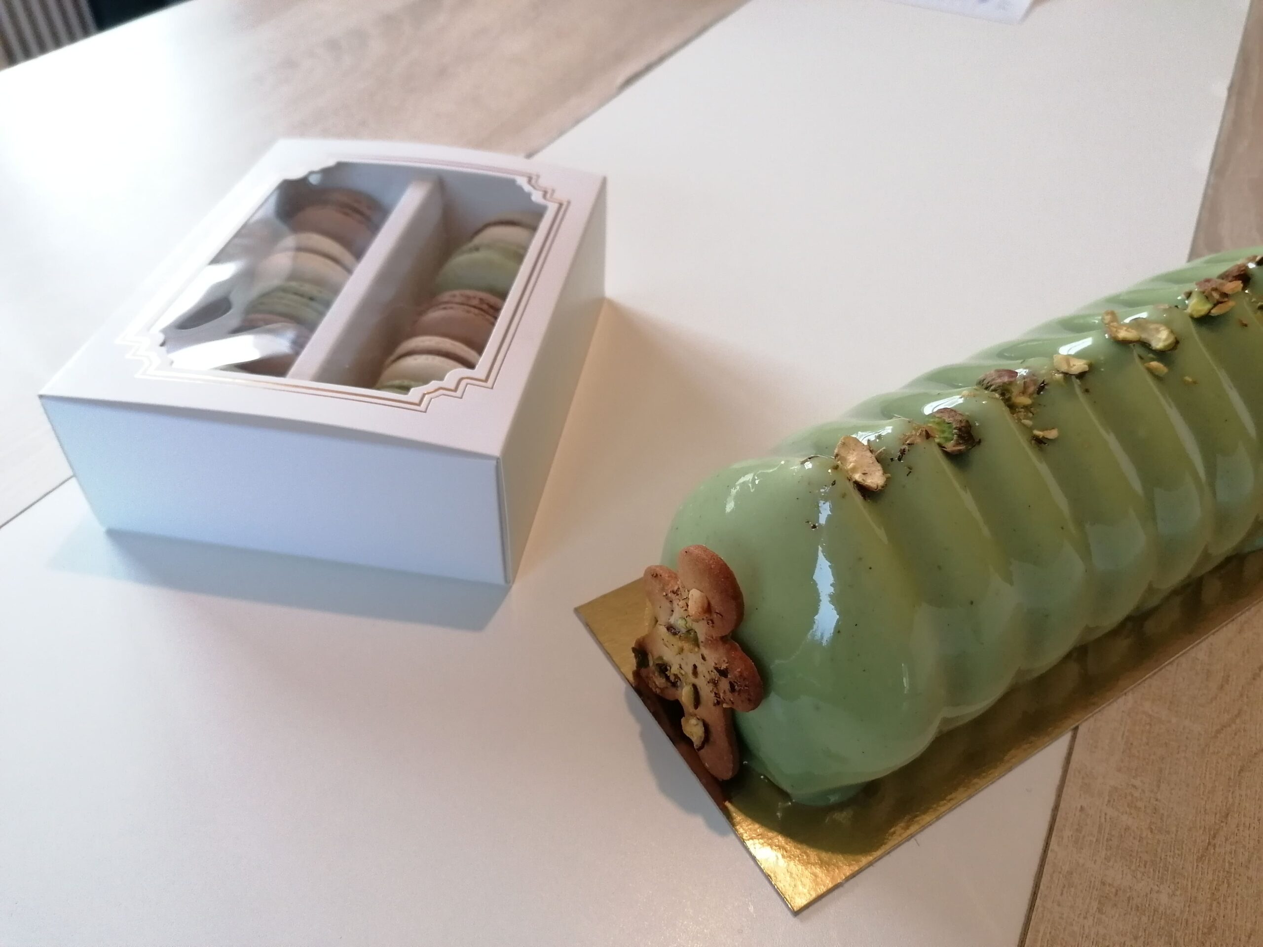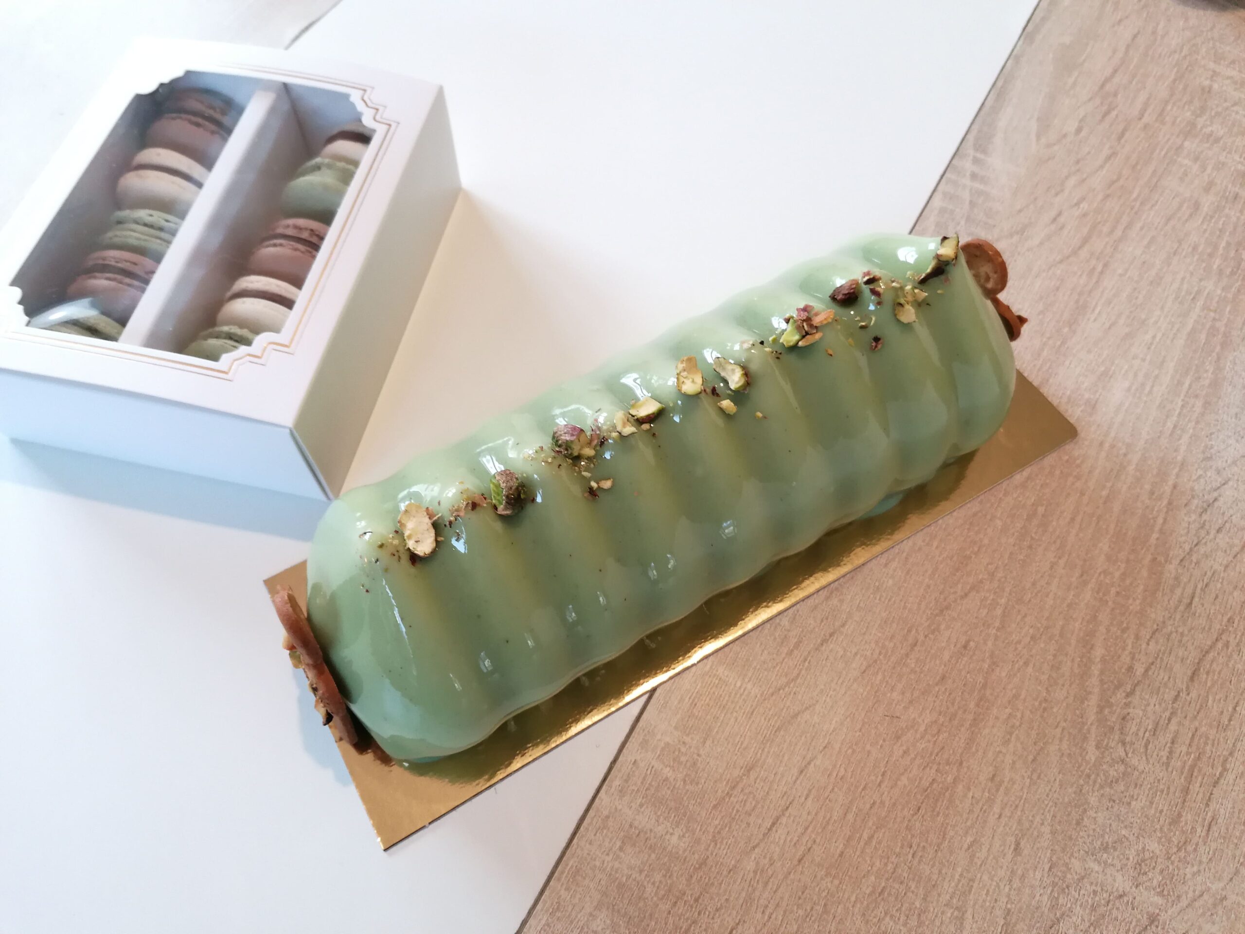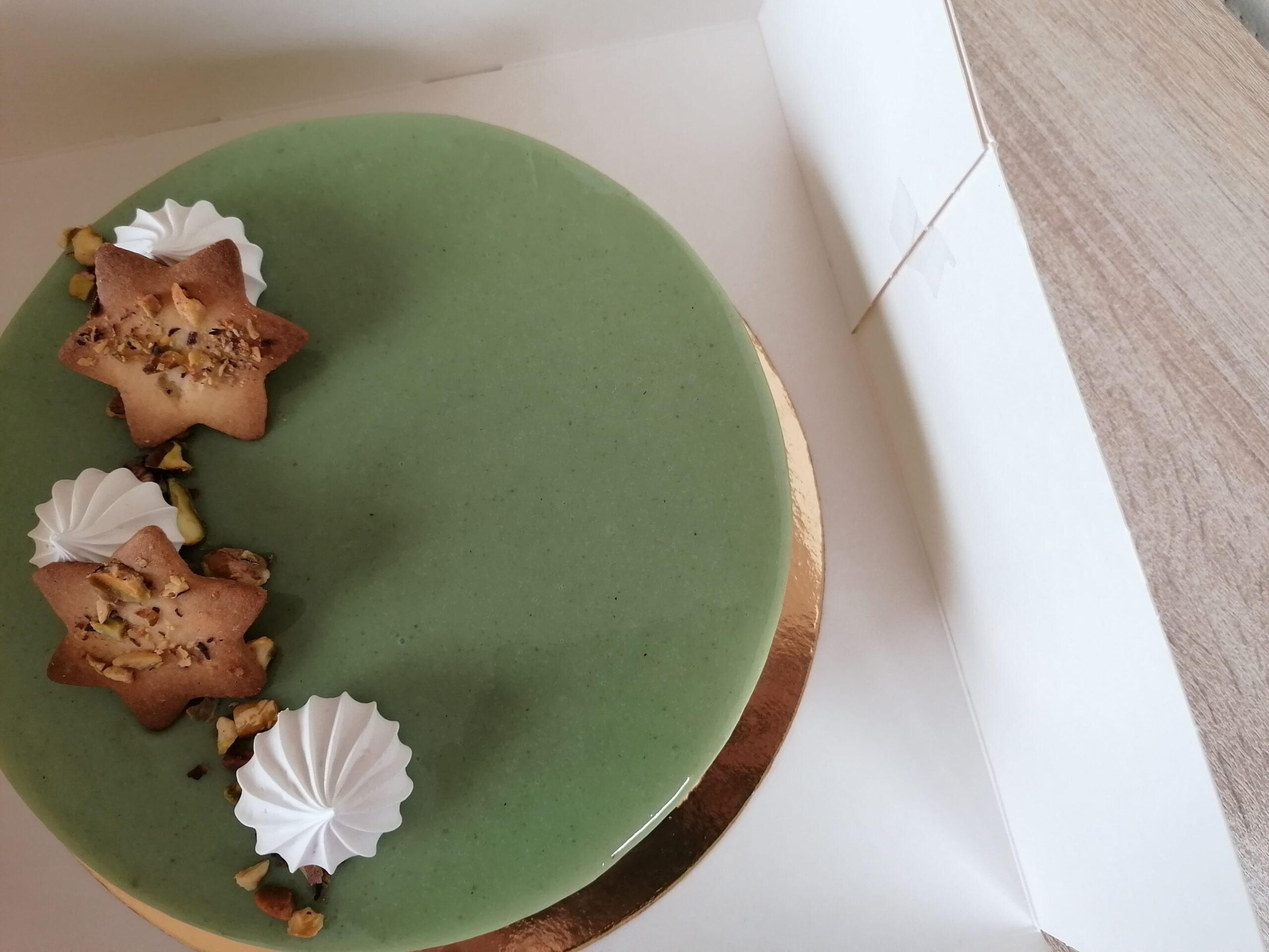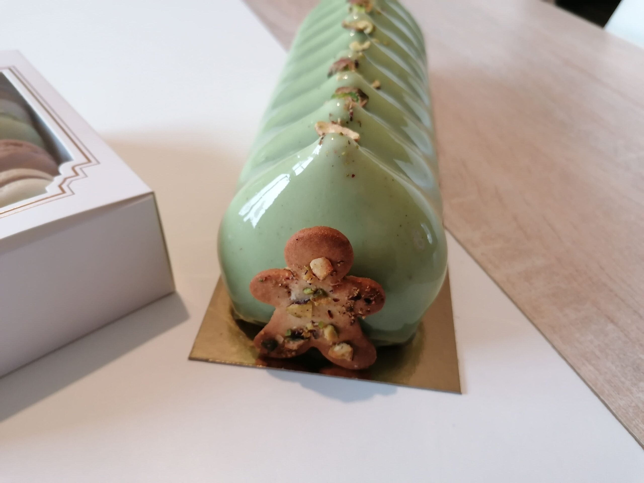 – Sa base : un biscuit financier pistaches recouvert d’un croustillant pistaches– Son insert : un crémeux pistaches– Sa garniture : une mousse bavaroise pistaches– Son glaçage : un glaçage miroir pistaches– Son pourtour : des pistaches torréfiées et concassées– Son décor final : des pièces en pâte sucrée composées de morceaux de pistaches et/ou des meringues aromatisées à la pistache, quelques pistaches torréfiées et concassées